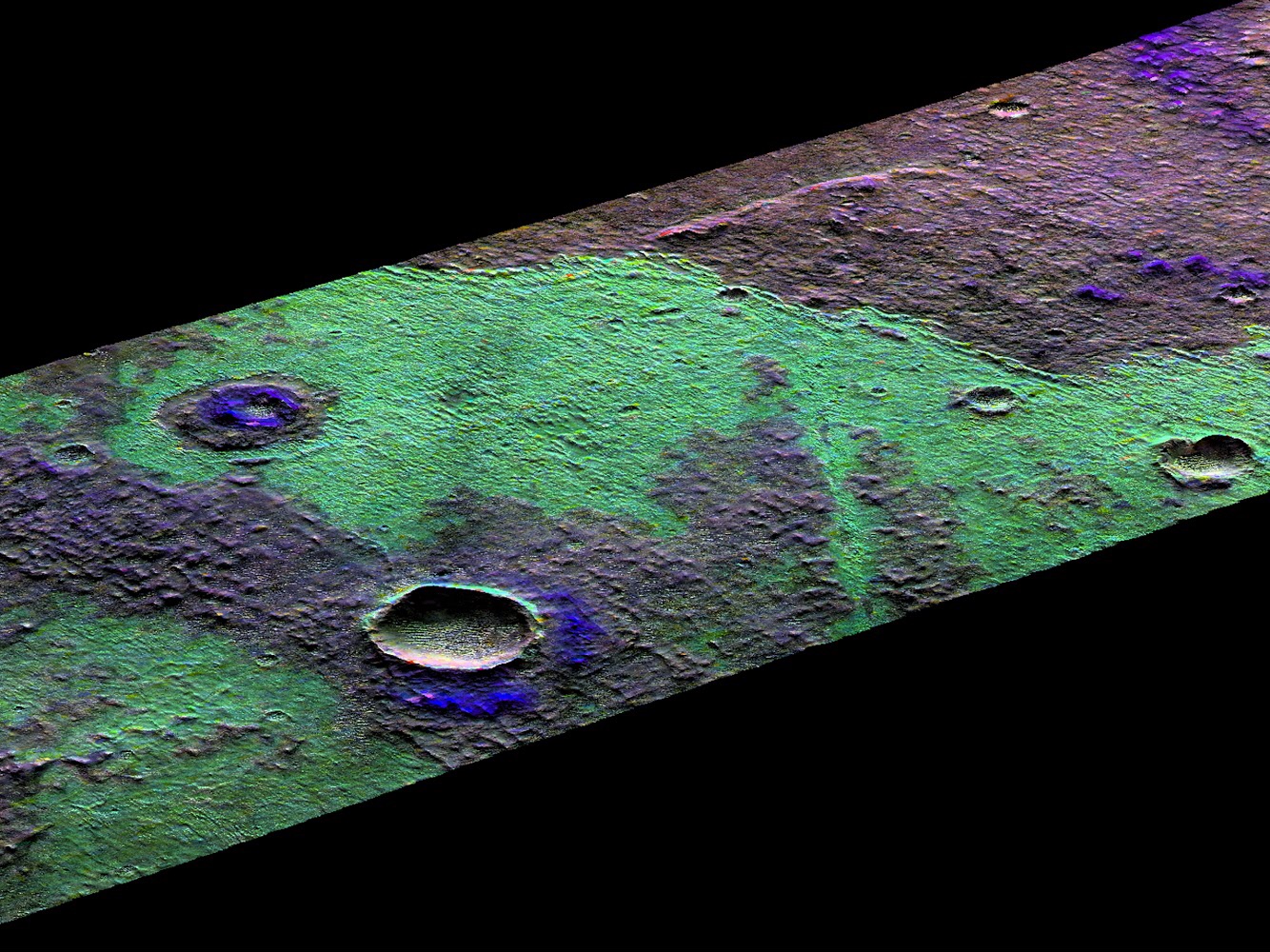 This 3D perspective view is a composite of both HiRISE and data from CRISM, another instrument onboard MRO. This view covers a small patch of ancient Martian real estate in Terra Sirenum. CRISM collects spectral data that can be used as a chemical fingerprint for the upper most surface. This information suggests that this small patch of surface is covered with salts (chlorides) represented in gree and water-rich clays that appear blue.